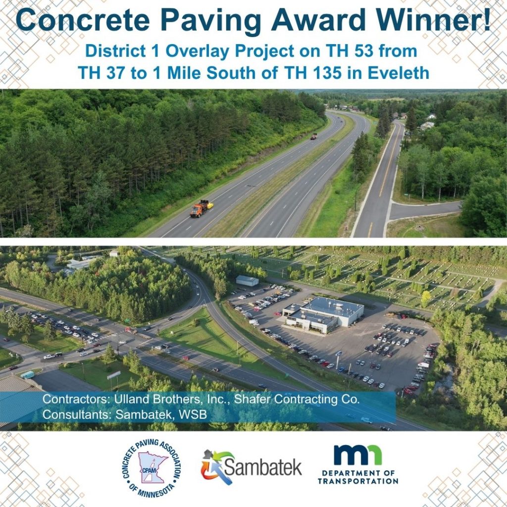 Sambatek is proud to share that the TH 53 Overlay Project in Eveleth (SP 6918-103) has received a 2026 Concrete Paving Award in the MnDOT Overlay category from the Concrete Paving Association of Minnesota (CPAM).